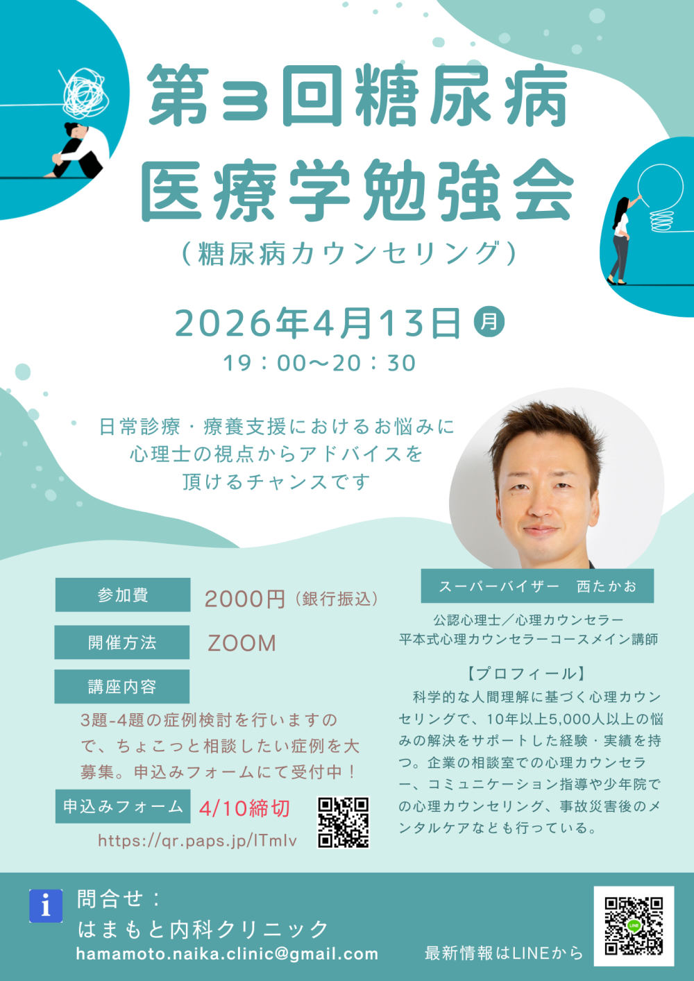 昨年10月に登壇いただいた公認心理士の西先生をお招きして勉強会を開催します。今回は完全オンラインのため、遠方からの参加の方も発言・質問可能です。糖尿病診療に携わる医療者の皆さまのご参加をお待ちしております。